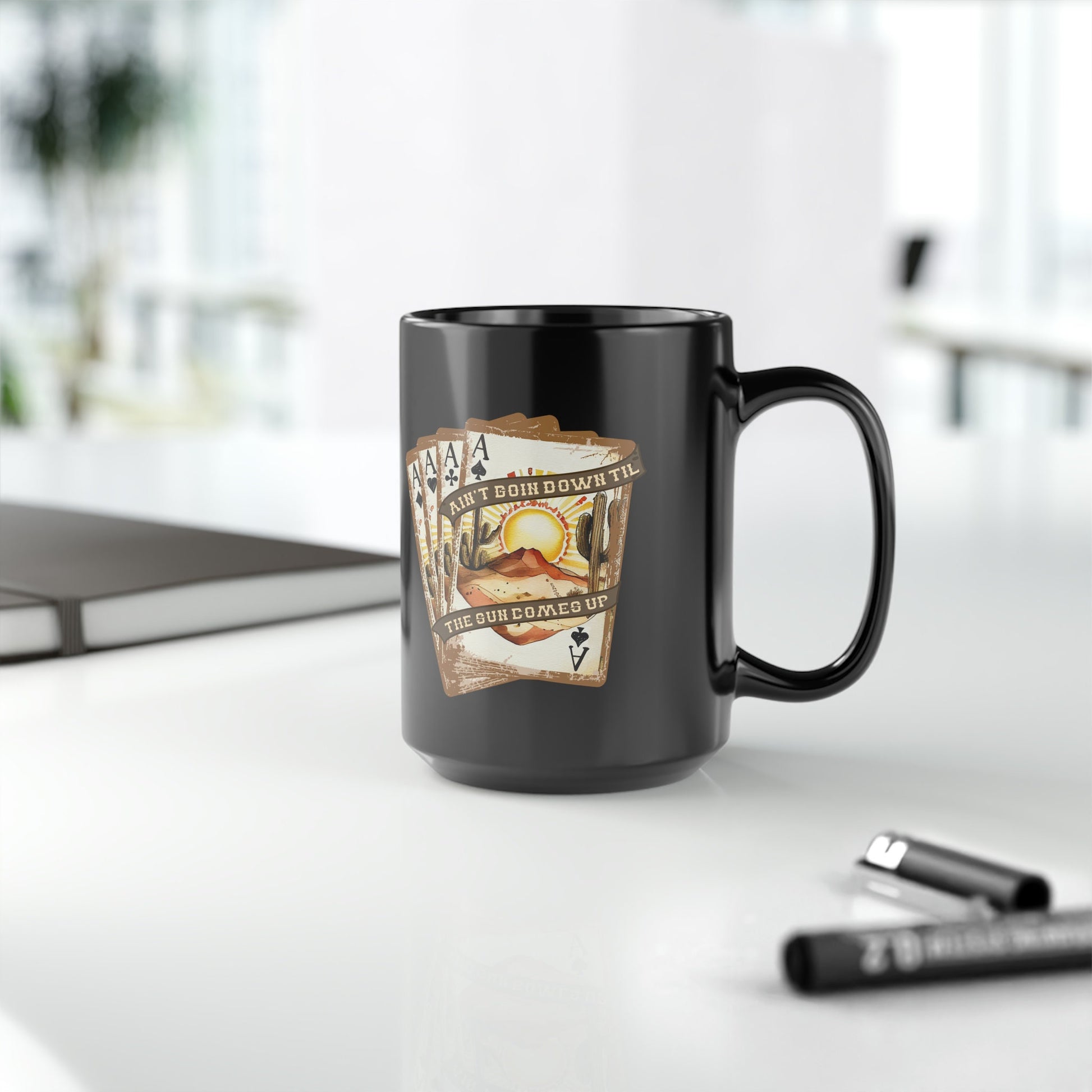 Aint Going Down Till The Sun Comes Up Four of a Kind Aces Poker Playing Cards Western Southwestern Cactus Mug, coffee tea black mug 15oz