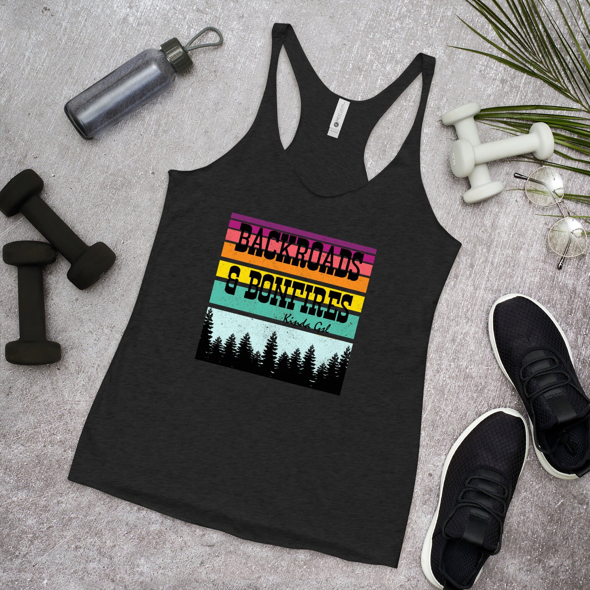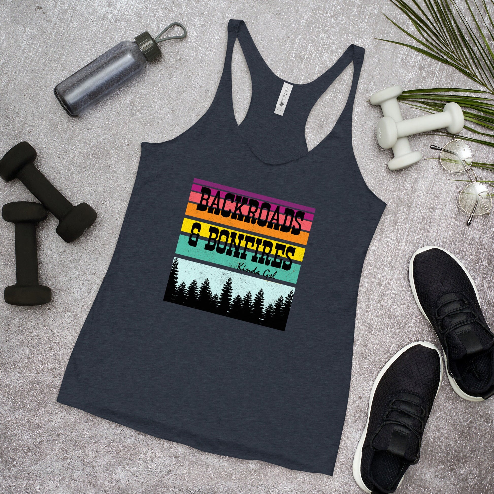 Backroads and Bonfires Kinda Gal Retro Sunset Women's Racerback Tank