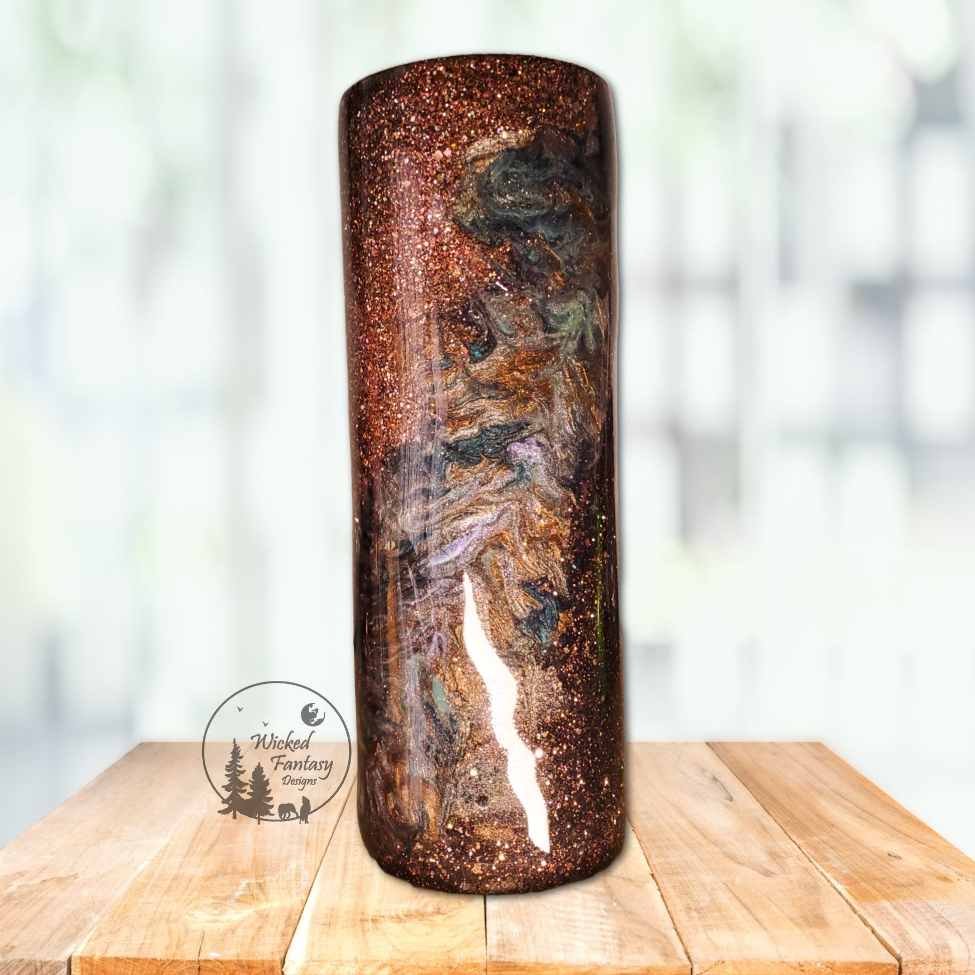 Featuring Beautiful Crazy with a mica swirl and glitter base on a 20oz skinny tumbler.