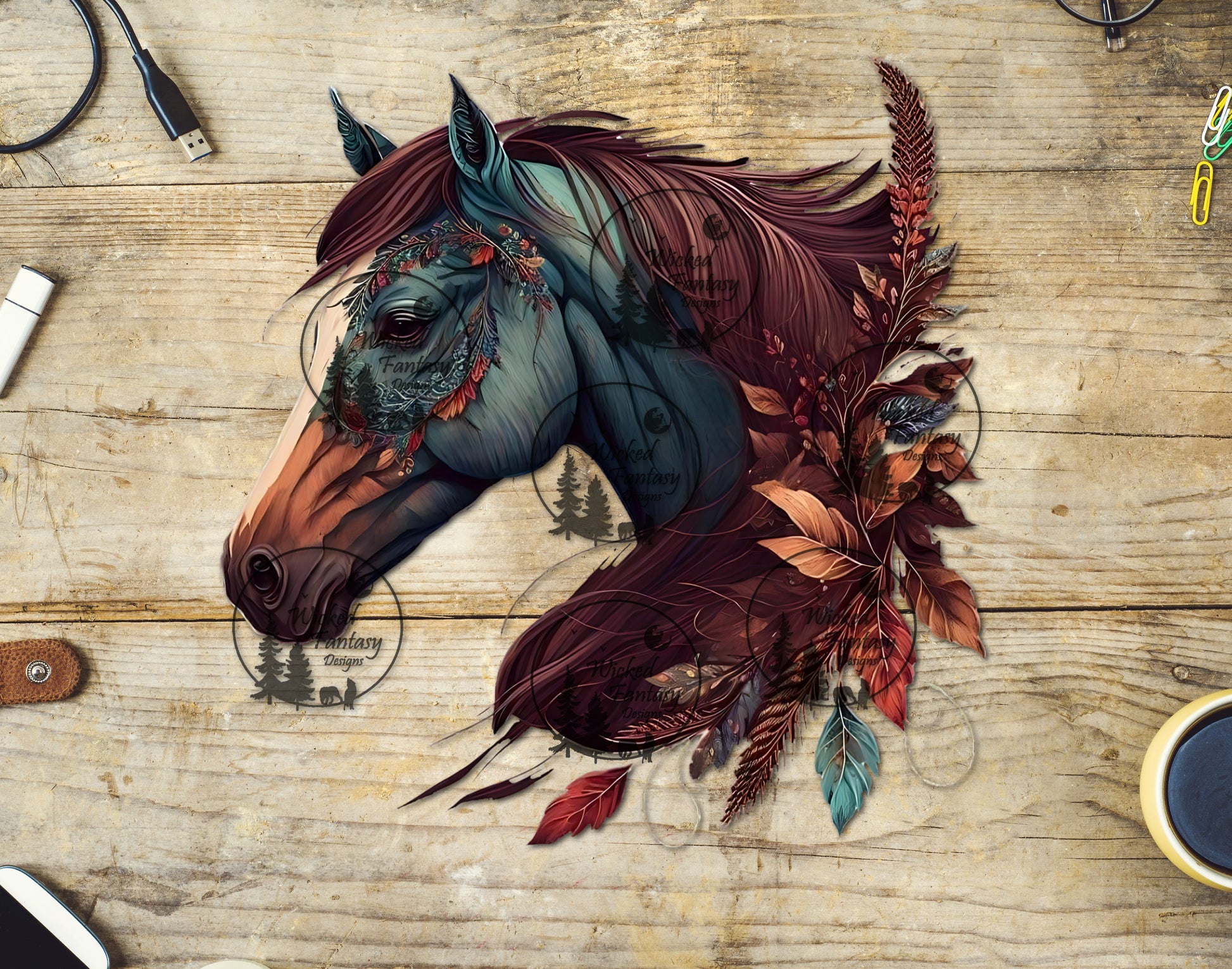 UVDTF Black Horse with Burgundy and Teal Feathers