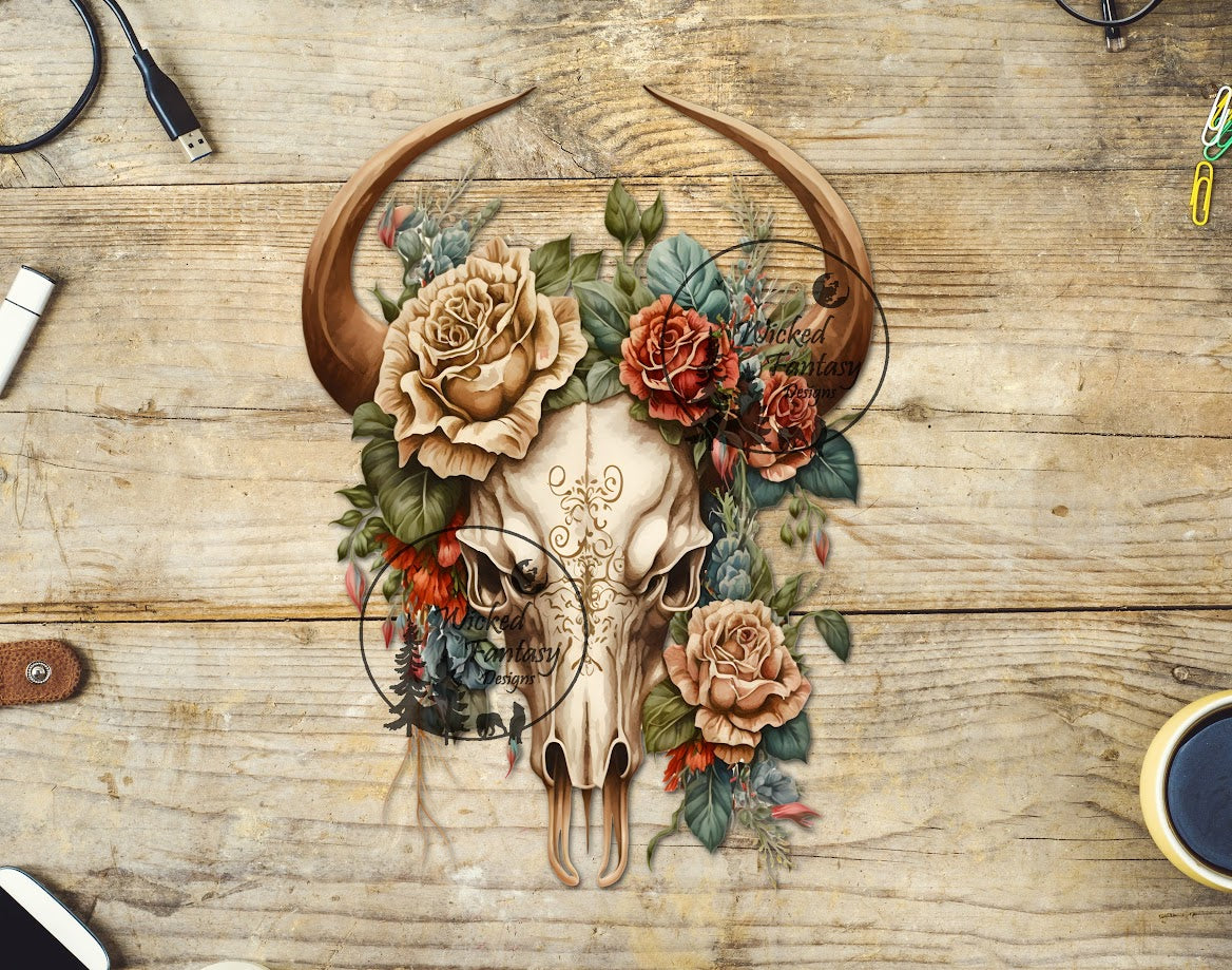 UVDTF Boho Cow Skull Gold Red Roses 1pc