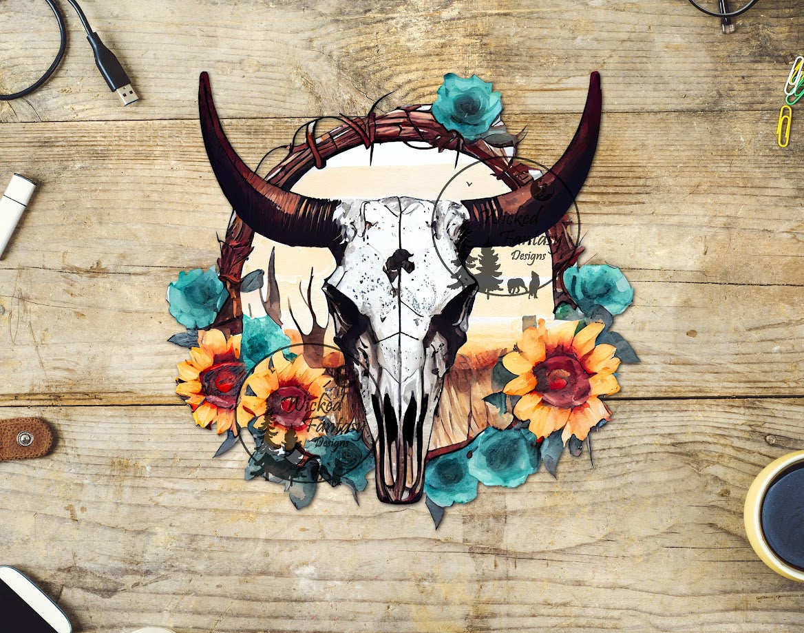 UVDTF Cow Skull Western Desert Sunflowers Blue Flowers 1pc