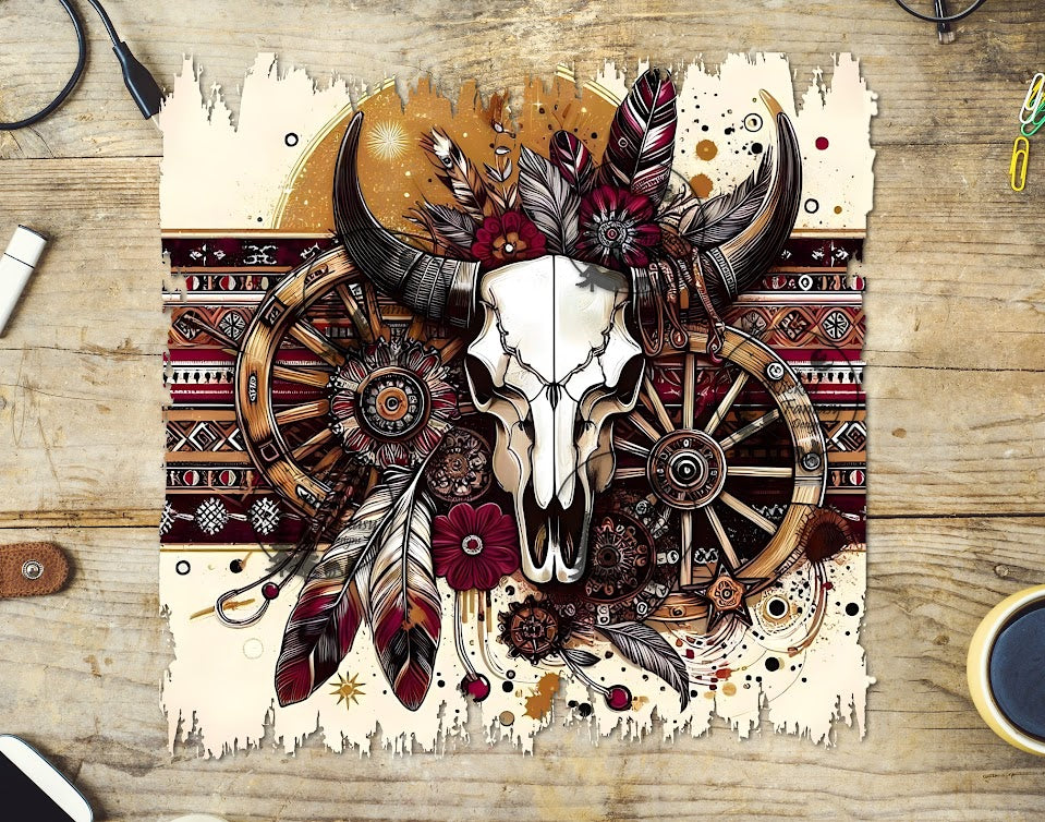 UVDTF Cow Skull with Beige and Burgundy Aztec Stripes