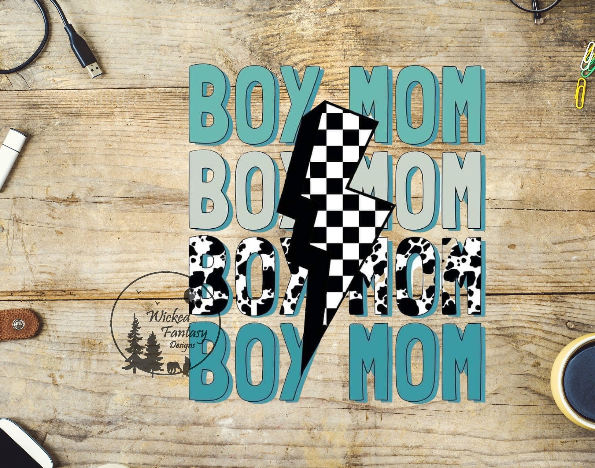 UVDTF Decal Boy Mom Blue White Cowprint Lightning Transparent Background 1pc
