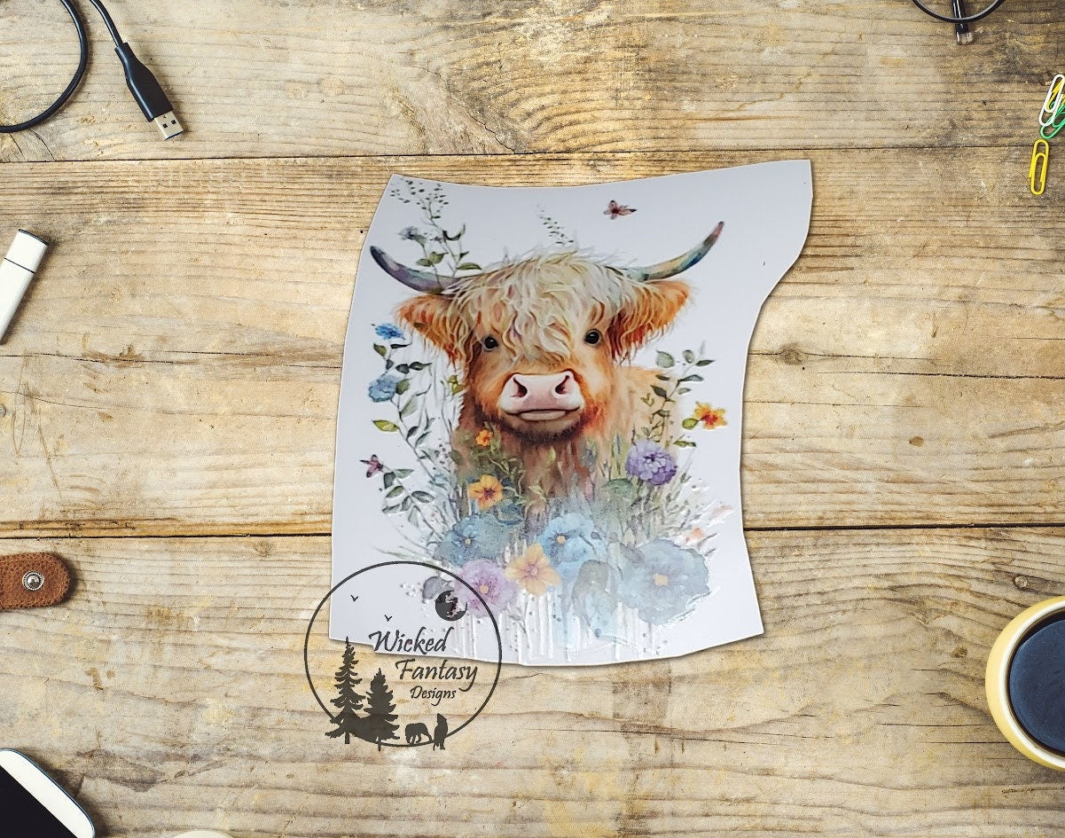 UVDTF Decal Cute Highland Cow Pastel Flowers 1pc