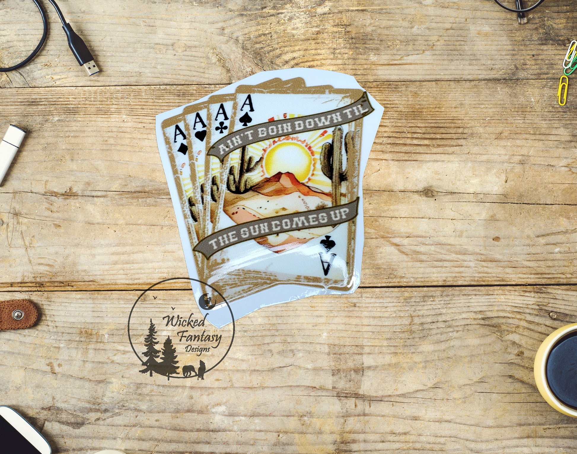 UVDTF Decal Hand of Cards Aint Goin Down til the Sun Comes Up Southwestern Desert Cactus Aces Four of a Kind Transparent Background sticker