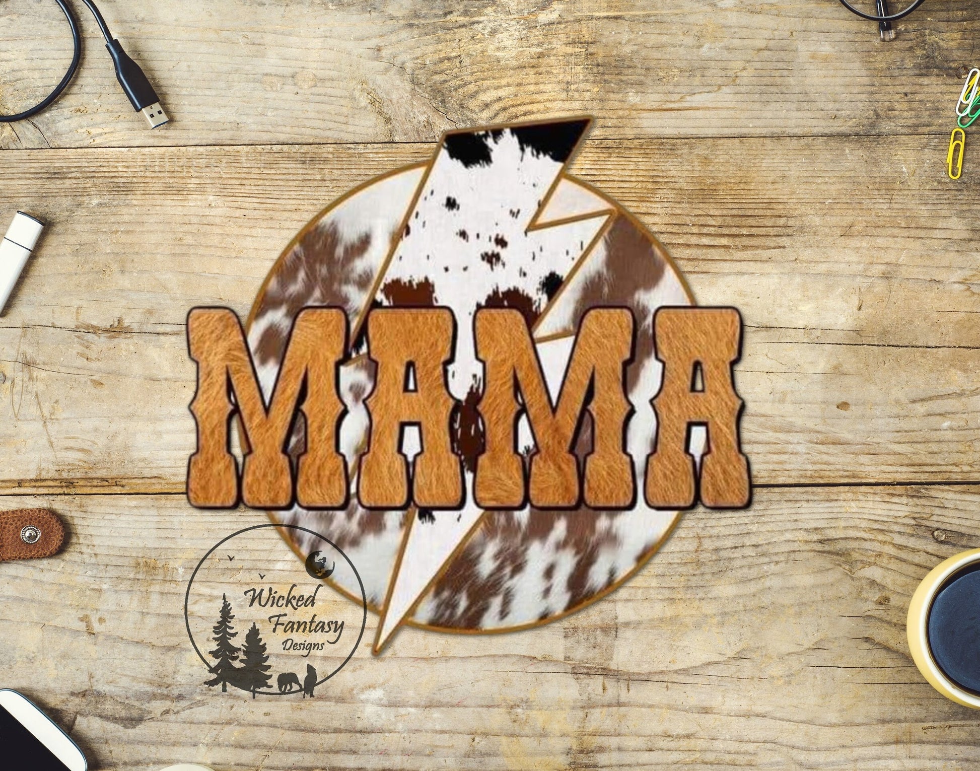 UVDTF Decal Mama Cowhide and Gold Lightning Bolt Transparent Background 1pc