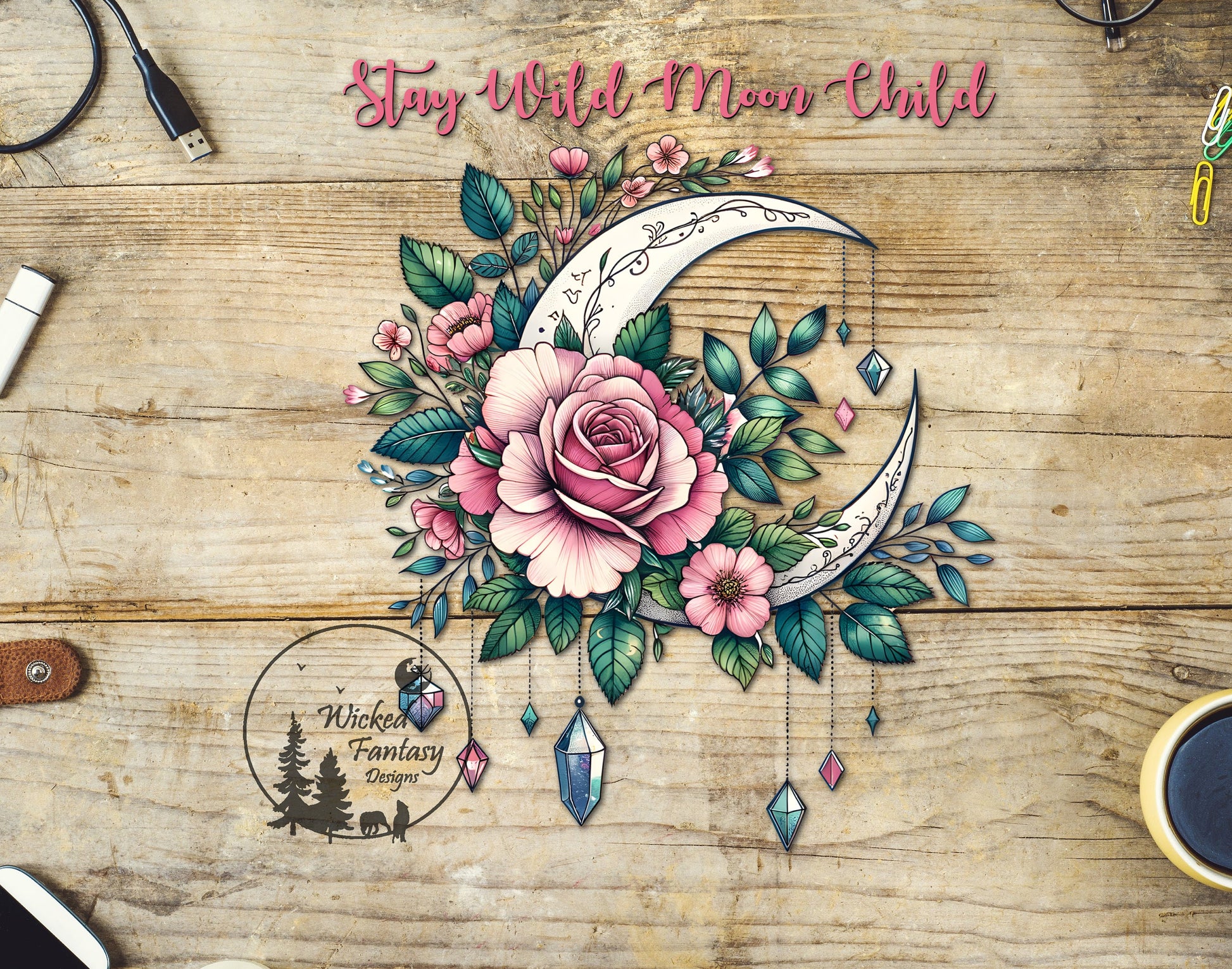 UVDTF Decal Stay Wild Moon Child Crescent Moon Stars Crystals Roses 1pc