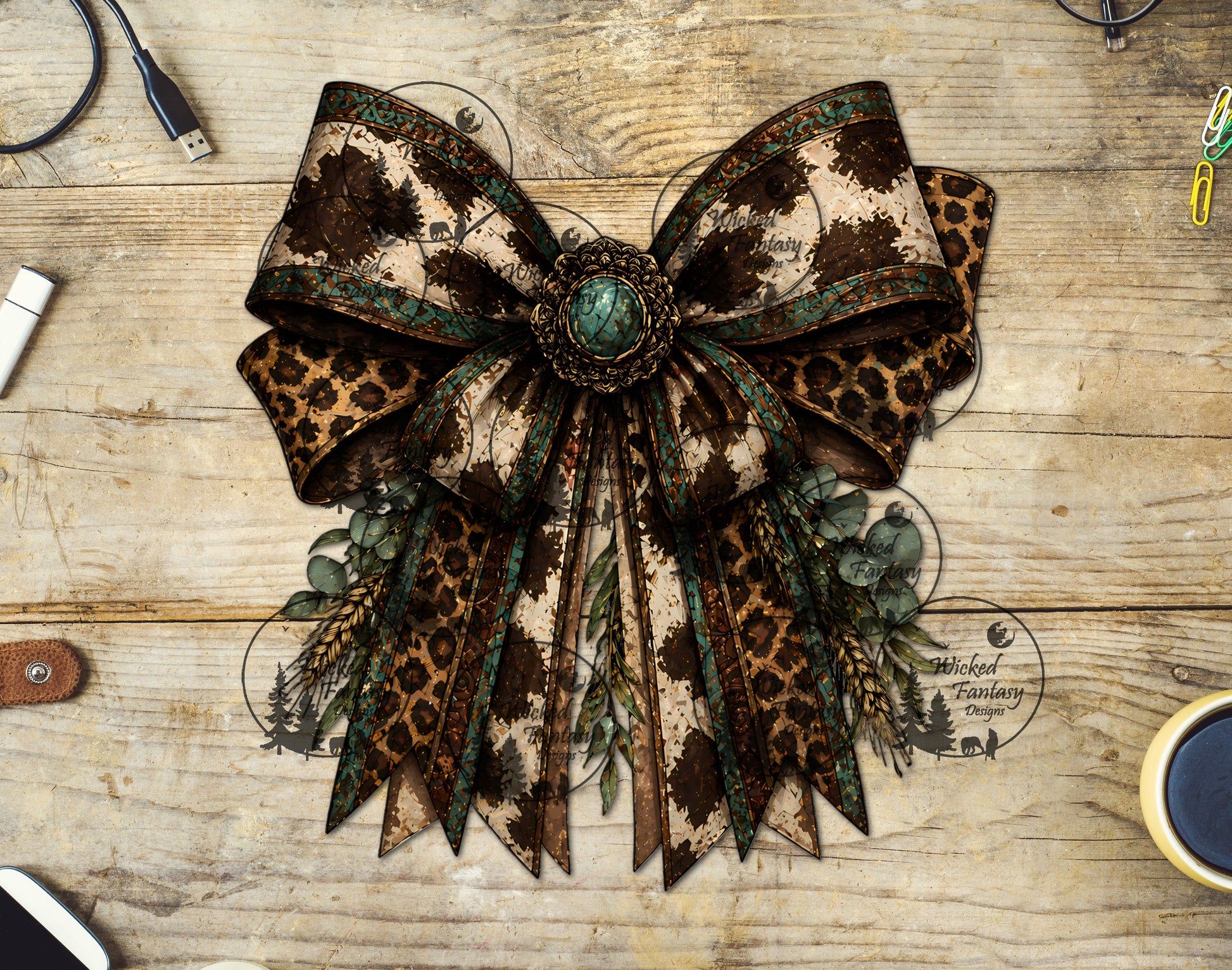 UVDTF Grunge Cow Print and Leopard Bow with Eucalyptus