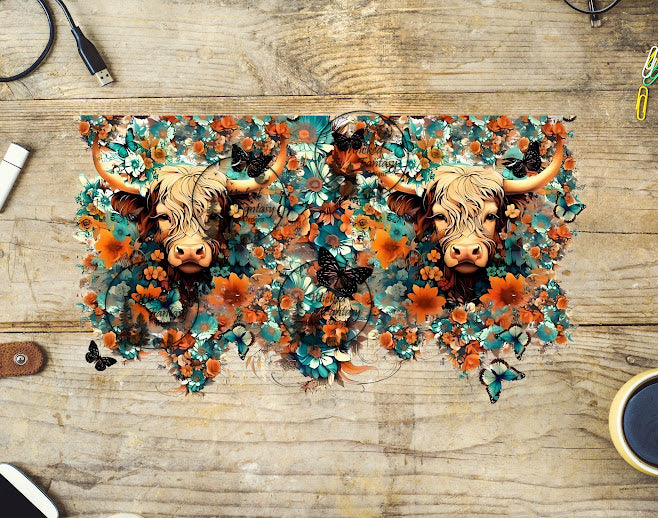 UVDTF Highland Cow with Teal and Rust Flowers 16oz 40oz Tumbler Wrap Element