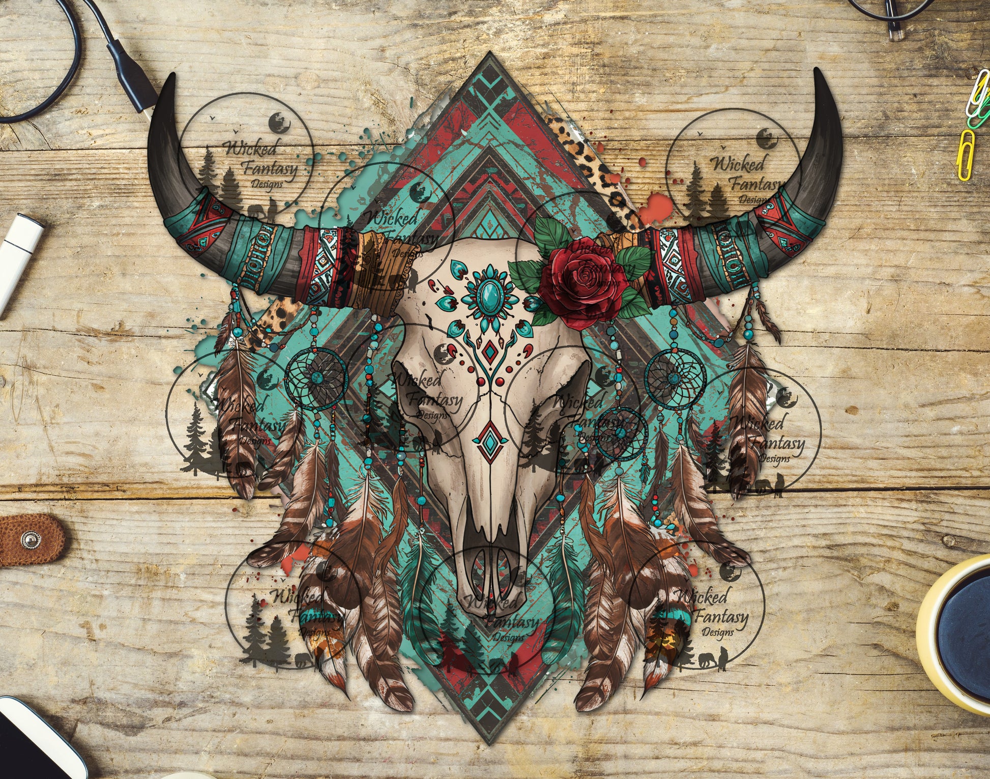 UVDTF Red and Turquoise Cow Skull with Feathers
