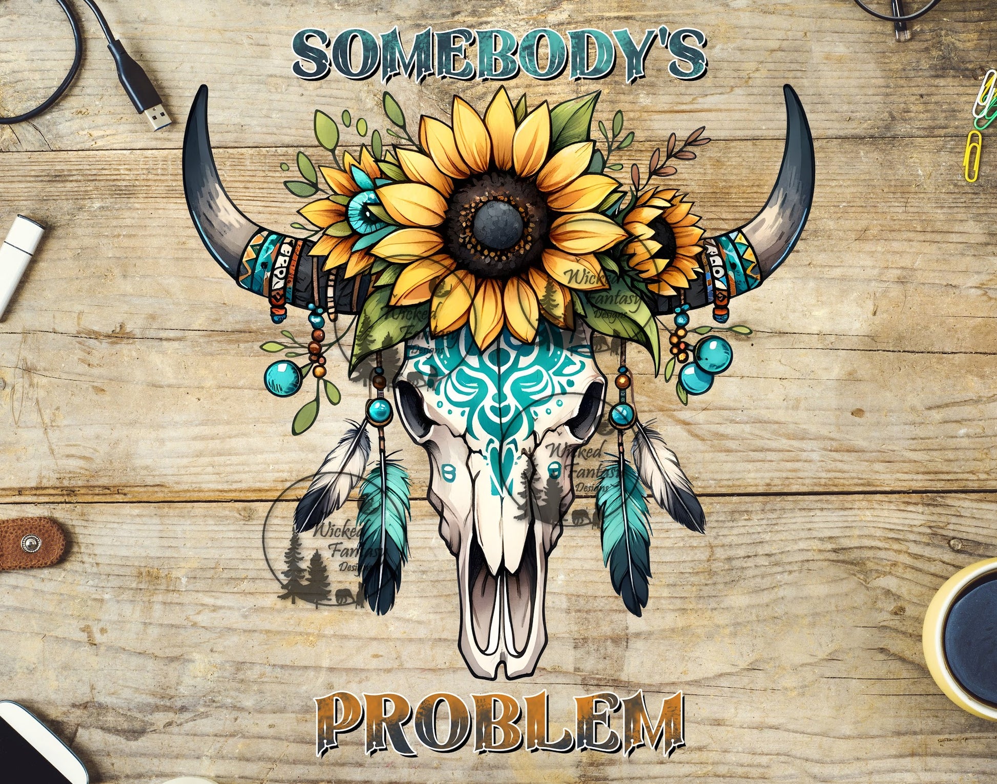 UVDTF Somebody's Problem Bull Skull with Sunflowers and Feathers