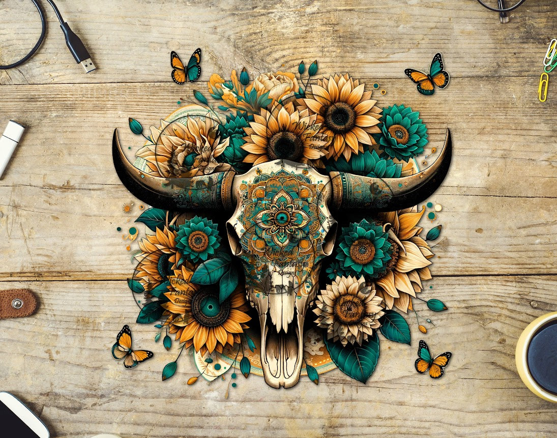 UVDTF Teal Sunflowers Boho Cow Skull with Feathers
